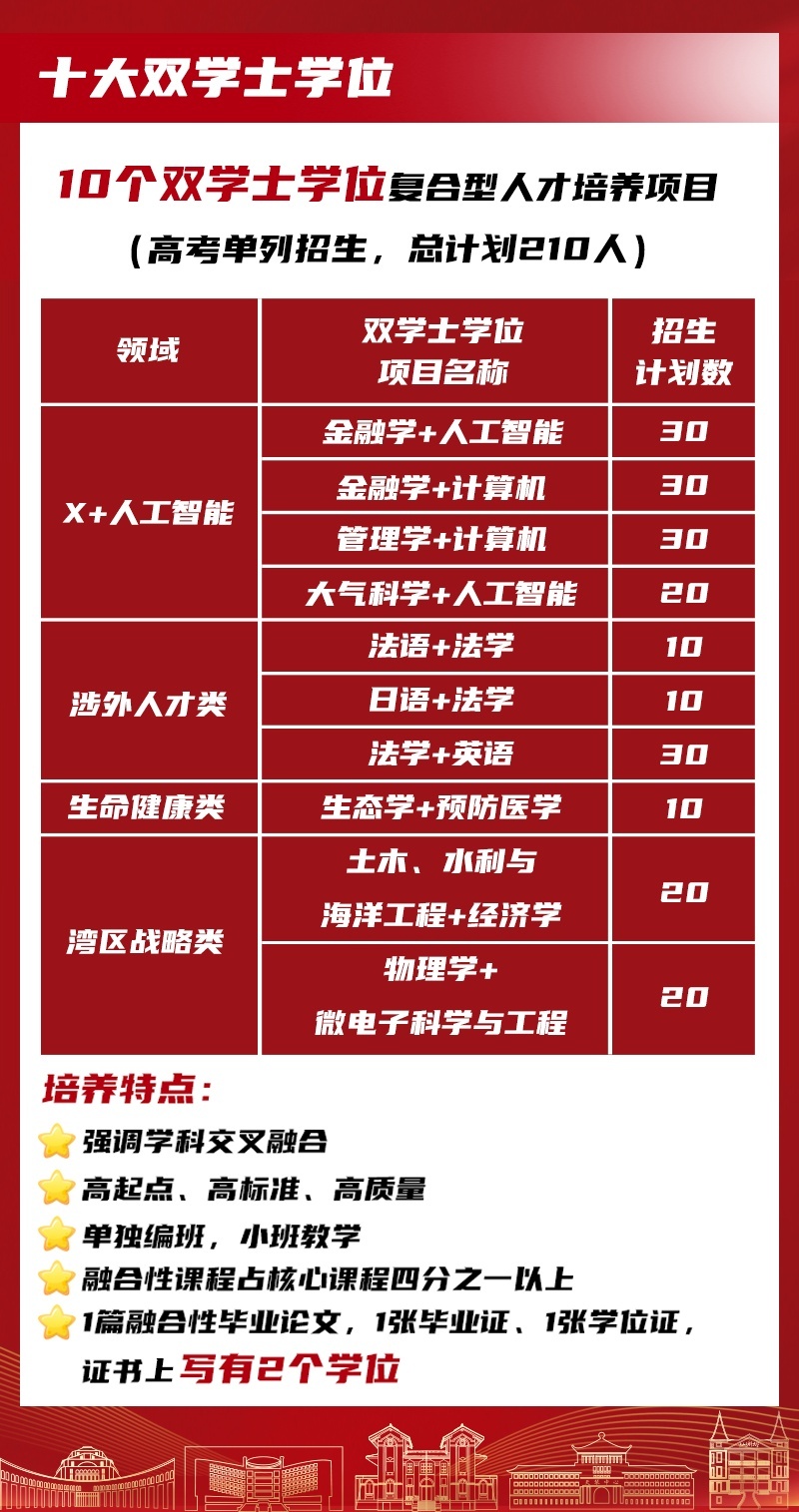 本年中山大学新增10大“双学士学位复合型东谈主才培养形态”,隆起学科交叉交融,职业国度策略和经济社会发展需求,为学生提供跨学科学习、各种化发展契机。这10个双学士学位形态在高登科单列专科招生,寰宇总有盘算推算为210名。