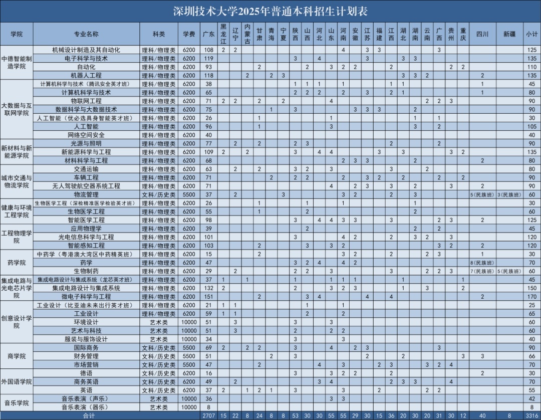 深圳工夫大学2025年有盘算推算面向广东、黑龙江、辽宁、内蒙古、甘肃、青海、宁夏、陕西、山西、河北、山东、河南、安徽、江苏、福建、江西、湖北、湖南、云南、广西、贵州、重庆、四川、新疆等24个省份招生,有盘算推算招生3350东谈主。