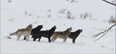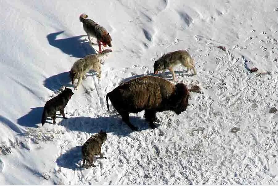 猎物一朝停驻来,狼群四面八方撕扯猎物,最终猎物卒,狼群大快朵颐。