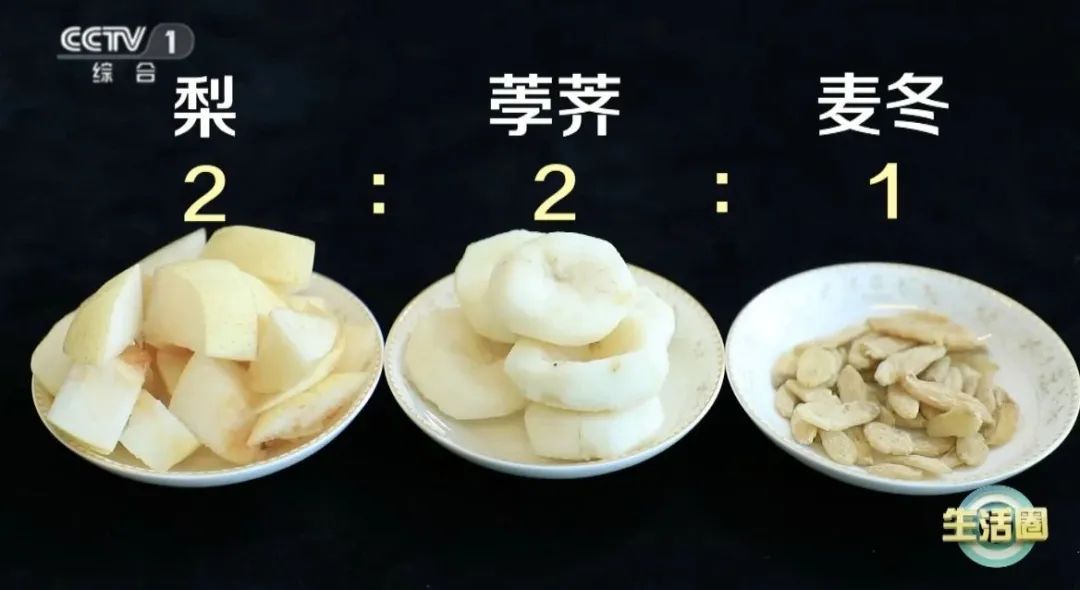 取梨、荸荠、麦冬,比例为 2 : 2 : 1,把3种原料放入养生壶中,加水煮15分钟即可。