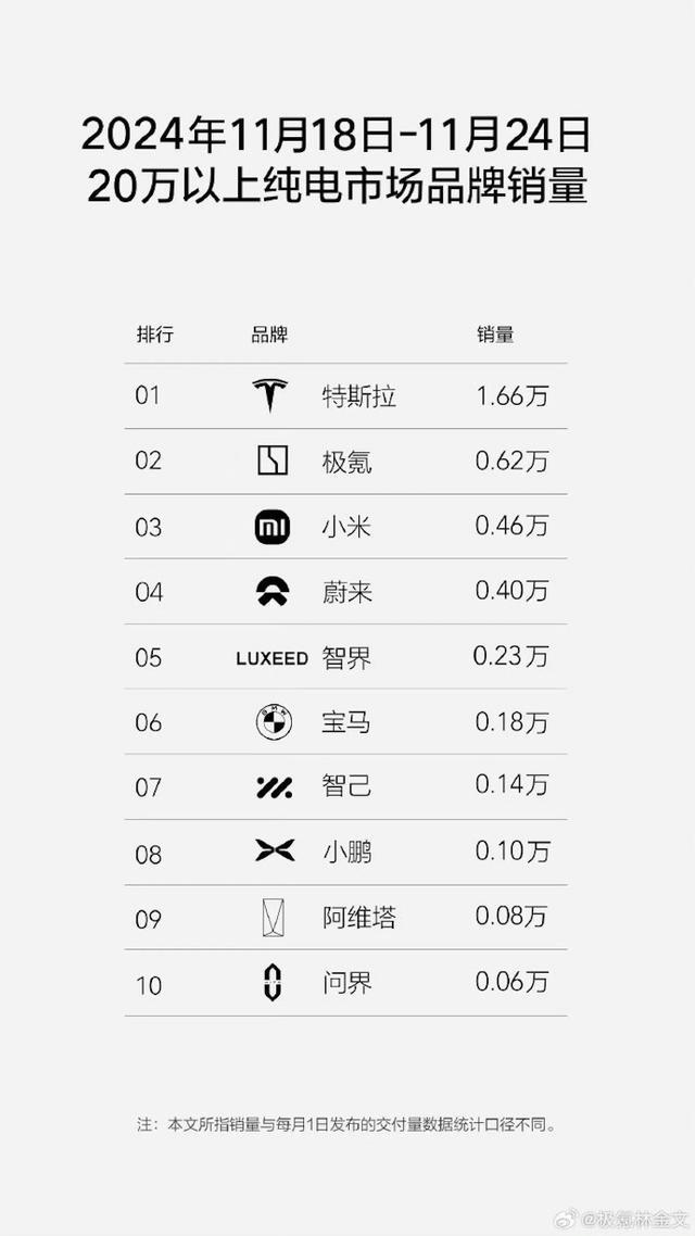 若是探询一下国内新动力车的销量,许多奇怪的操作就有了端倪。在上周20W以上纯电车销量中,特斯拉一骑绝尘,但极氪紧随后来,其品牌影响力在自主品牌中特地大。